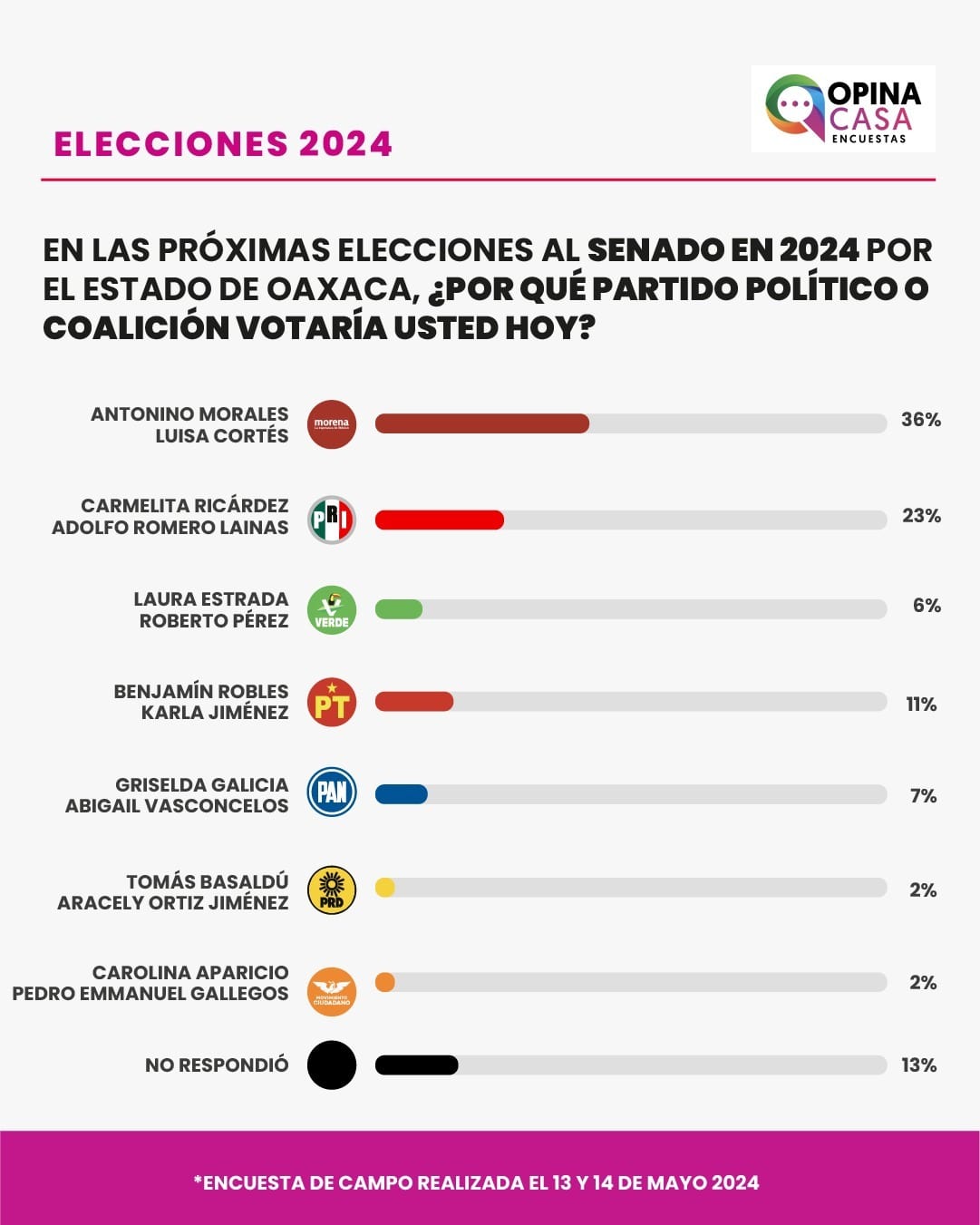 Antonino Morales, candidato de Morena, cuenta con un 36% de preferencia, mientras que Benjamin Robles del PT se sitúa en tercer lugar con un 11%. Griselda Galicia del PAN alcanza un 7%, seguida por Laura Estrada del PV con un 6%. Los candidatos Tomás Basalddú del PRD y Carolina Aparicio de Movimiento Ciudadano comparten un empate con un 2% de preferencia cada uno.