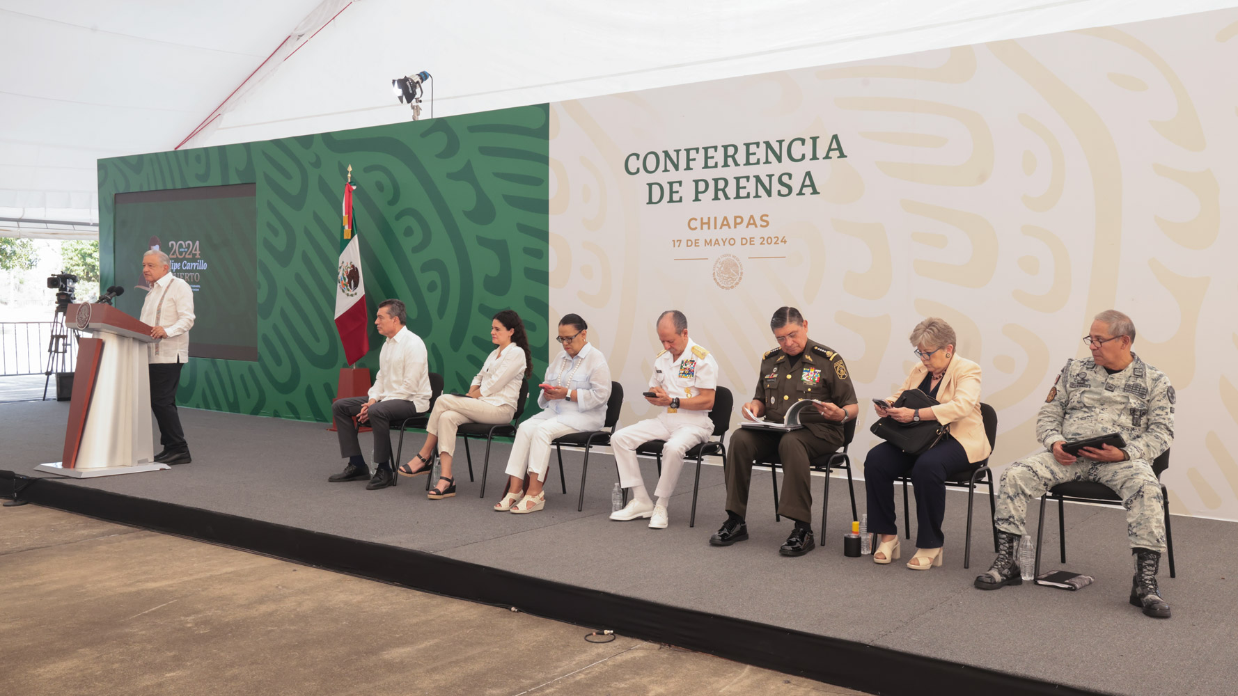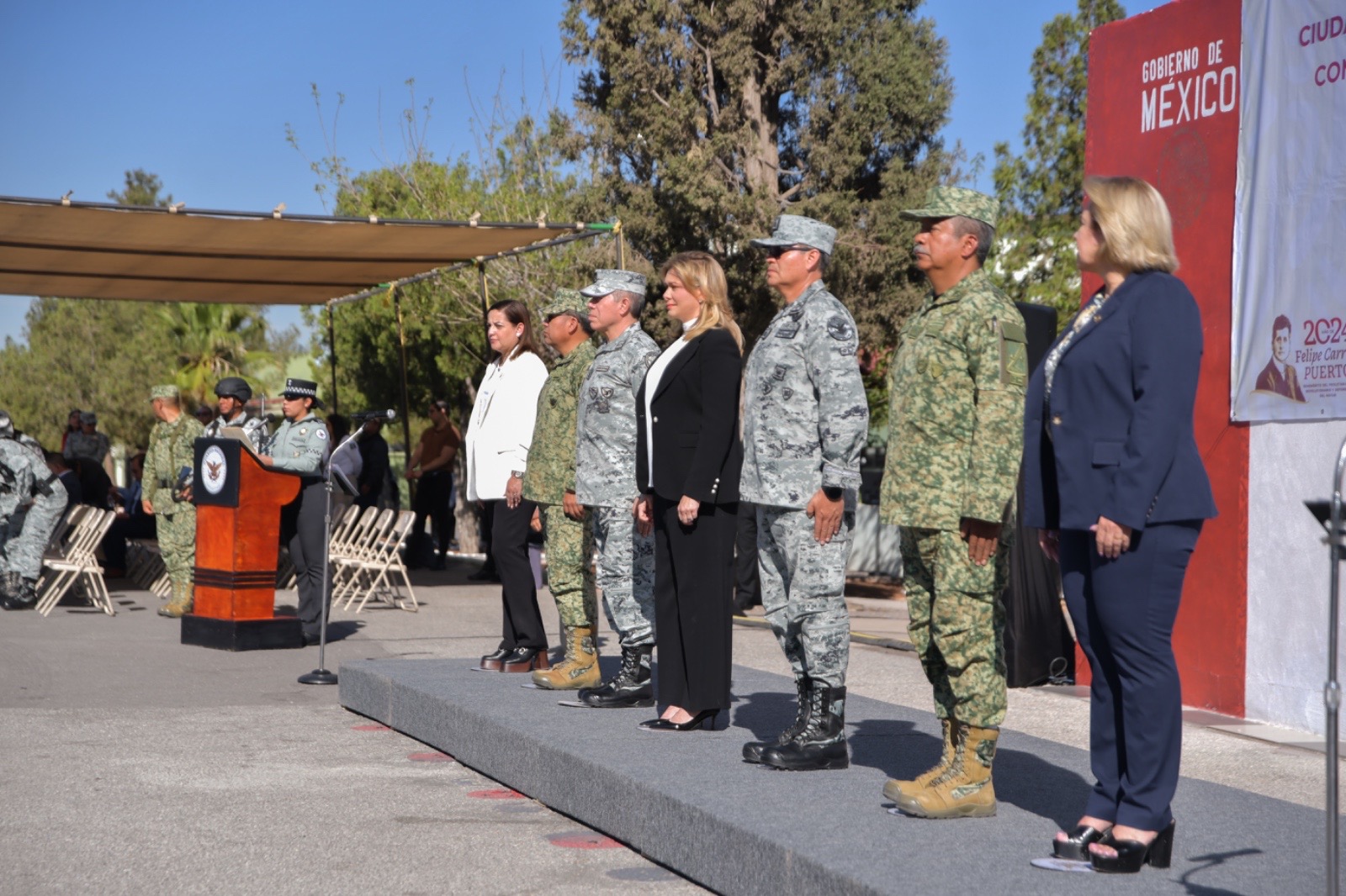 Además de la titular del Ejecutivo, también asistieron al evento las presidentas del Tribunal Superior de Justicia y del Congreso del Estado, los comisarios de las zonas militares 42ª y 5ª, y el titular de la Unidad de Órganos Especializados por competencia de la Guardia Nacional.