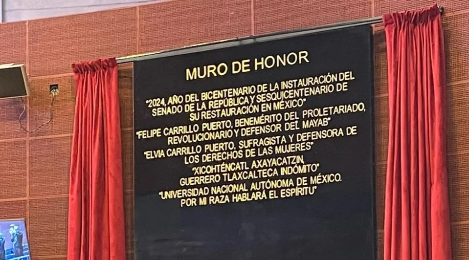 En ceremonia solemne, la presidenta de la Mesa Directiva, Ana Lilia Rivera Rivera, acompañada de senadoras, senadores, y de la comunidad universitaria, develaron en el Muro de Honor la leyenda: «Universidad Nacional Autónoma de México. Por mi raza hablará el espíritu”.