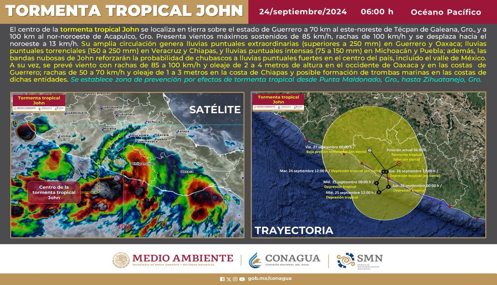 El huracán John pasó a ser una tormenta tropical a las 3:00 horas del martes 24 de septiembre. Su centro se localiza en tierra sobre Guerrero, a 45 kilómetros al nor-noroeste de Acapulco, Guerrero, y a 70 kilómetros al este-noreste de Técpan de Galeana. La amplia circulación del fenómeno natural generará lluvias intensas en la entidad.