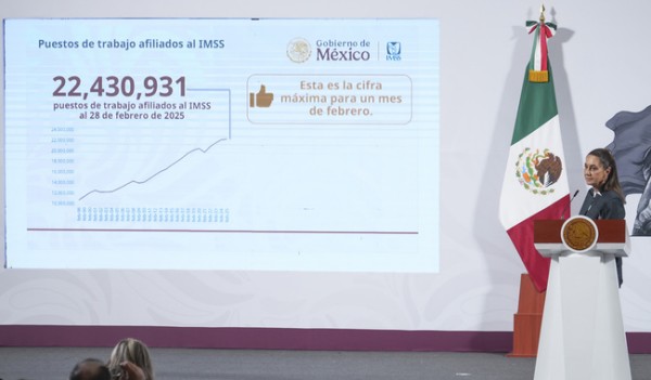La Presidenta de México, Claudia Sheinbaum Pardo, destacó que al 28 de febrero se tiene un registro histórico de 22 millones 430 mil 931 puestos de trabajo afiliados ante el Instituto Mexicano del Seguro Social (IMSS).